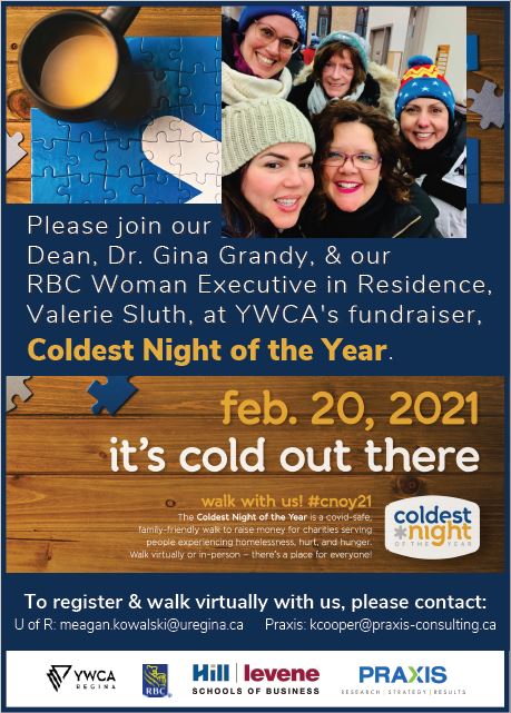 Please join U of R Dean, Dr. Gina Grandy, & our RBC Woman Executive in Residence, Valerie Sluth, at YWCA's fundraiser, Coldest Night of the Year.